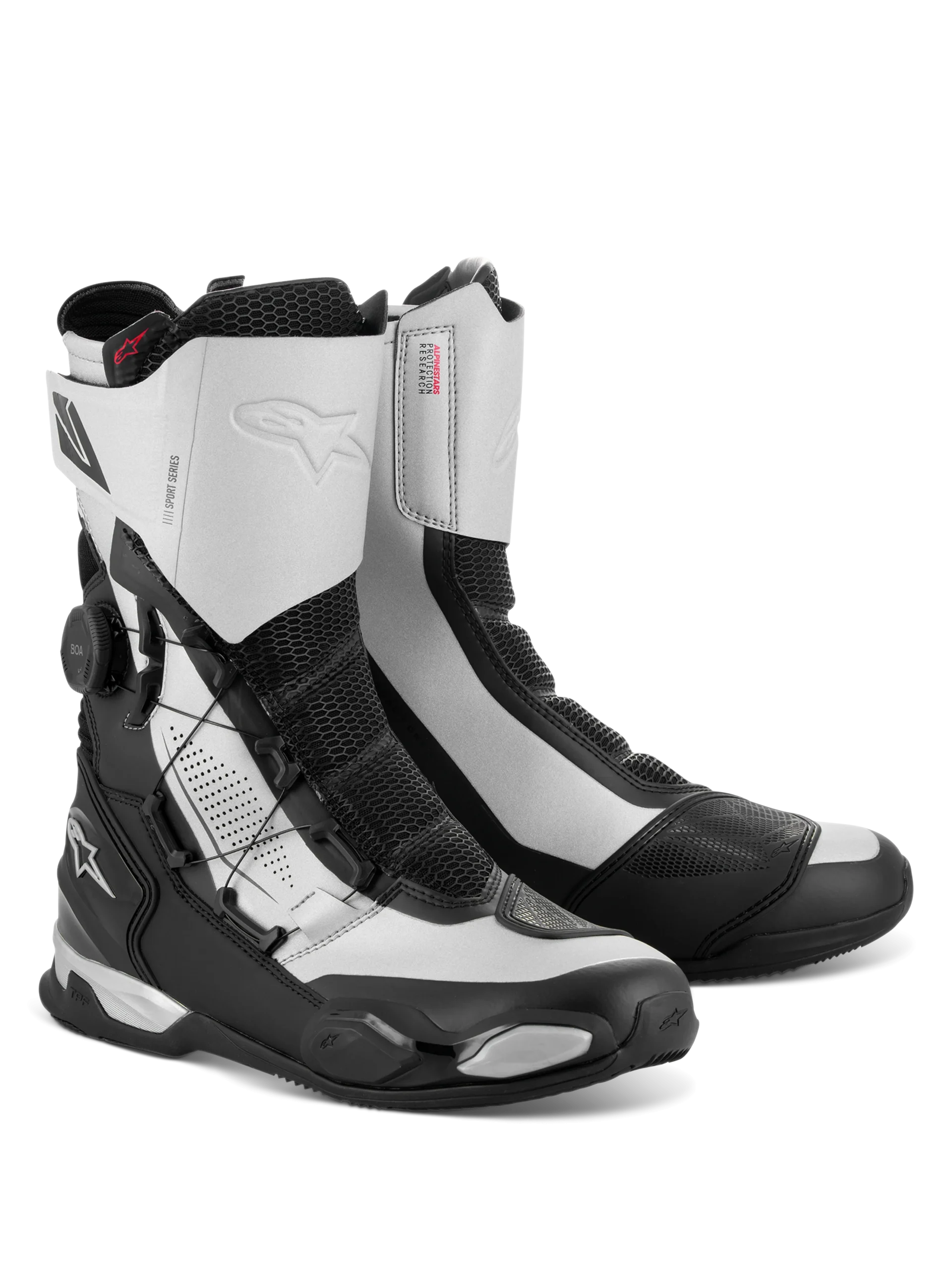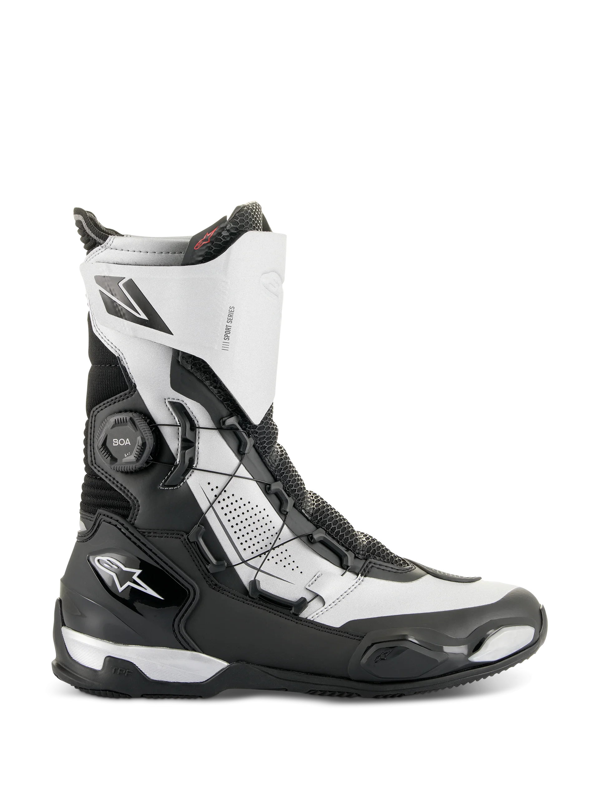 Les bottes SP-X BOA sont des bottes de sport élégantes conçues pour s’adapter aux pantalons de conduite techniques et pour offrir une capacité de marche supérieure. Optimisées pour le motard sportif et de touring sportif, les bottes SP-X BOA sont des bottes compactes de hauteur moyenne offrant des niveaux de protection et de confort supérieurs sur et en dehors de la moto. La tige est composée d’une combinaison de microfibres avancées, d’un matériau Rideknit® ultra-doux et d’une maille tricotée, ainsi que de pièces thermo-soudées sans couture. La partie inférieure est dotée d’un contrefort de talon en TPU, d’une glissière pour les orteils et du cadre de protection transversale TPF Alpinestars sur la semelle, ce qui permet d’obtenir des niveaux élevés de protection contre les chocs et les flexions ou les torsions. De plus, la semelle présente un tout nouveau design avec un talon arrière asymétrique pour faciliter la foulée naturelle du motard et promouvoir la stabilité en dehors de la moto. Pour la protection, les bottes SP-X BOA sont dotées d’un protège-tibia intégré, de disques de cheville à double densité, d’une plaque de changement de vitesse en TPU et d’un renforcement de la glissière des orteils. Pour le confort, les zones tricotées sur les points de flexion avant et arrière offrent une grande liberté de mouvement, tandis que la semelle intermédiaire en PU avec double coussin intégré au talon et la semelle intérieure OrthoLite® amovible offrent un grand confort de marche. Ces bottes sont faciles à mettre et à retirer grâce à une fermeture éclair médiane combinée au système BOA® Fit System pour une fermeture compacte et précise. Les bottes SP-X BOA sont idéales pour les conducteurs sportifs qui recherchent une couverture et une protection sans pour autant avoir besoin d’une botte de course complète et d’un look sur le pantalon. Microfibre avancée et mollet Rideknit® ultra-doux. Contrefort de talon, plaque de changement de vitesse, curseur d’orteil et protection Rotor en TPU. Système de fermeture latérale BOA speed conçu pour une fermeture optimale et un ajustement personnalisé. Soufflet avant en Lycra co-injecté avec du TPU souple pour un confort et une durabilité accrus. Deux coussins d’amortissement au niveau du talon. Semelle intermédiaire en PU intégrée au talon. Pièces de protection en TPU. Semelle anatomique amovible en EVA avec doublure en Lycra. Nouvelle semelle en caoutchouc exclusive Alpinestars. Profil étudié pour le confort. Rouleau de marche et forme asymétrique du talon pour la stabilité de la marche. Forme talon repose-pieds et adhérence étudiée. Protection interne double densité de la malléole contre les chocs. Protège-tibia intégré. Conformément à la législation européenne, le marquage CE est une obligation pour la commercialisation de ce produit. Le produit est conforme aux normes suivantes : Homologation CE EN13634:2017.