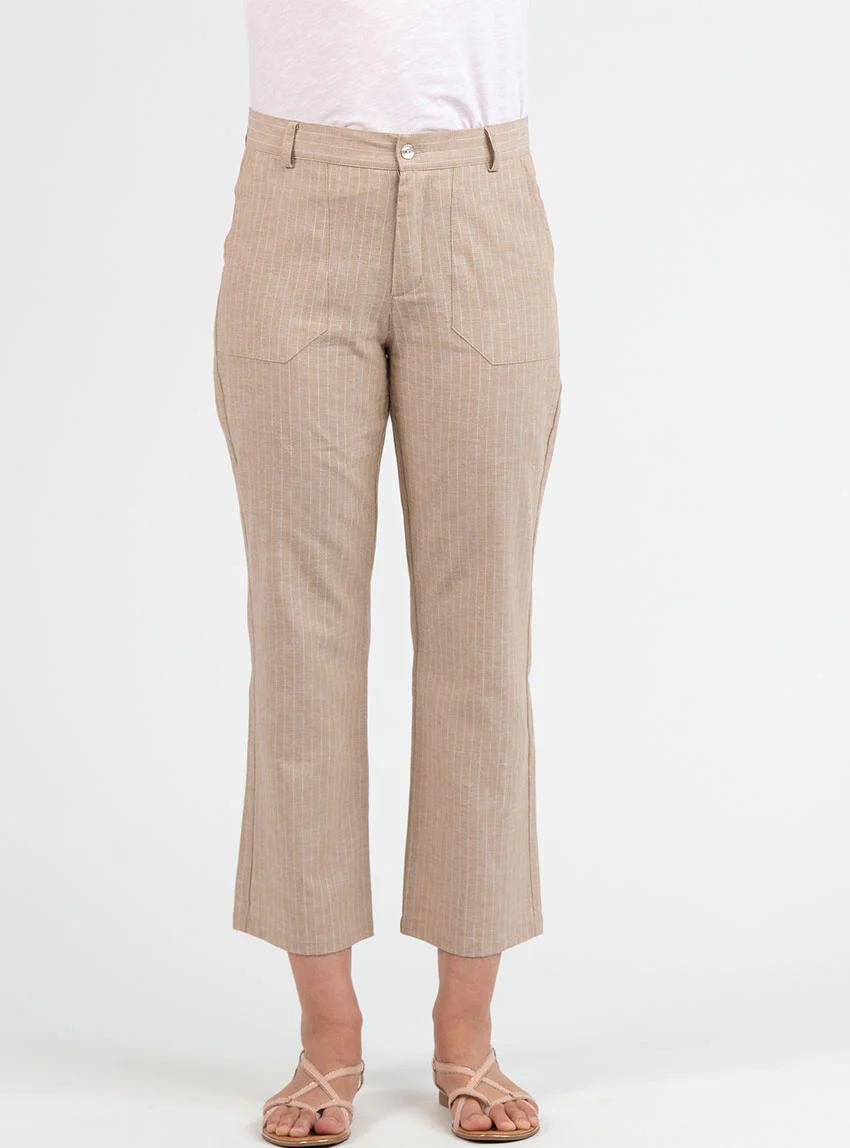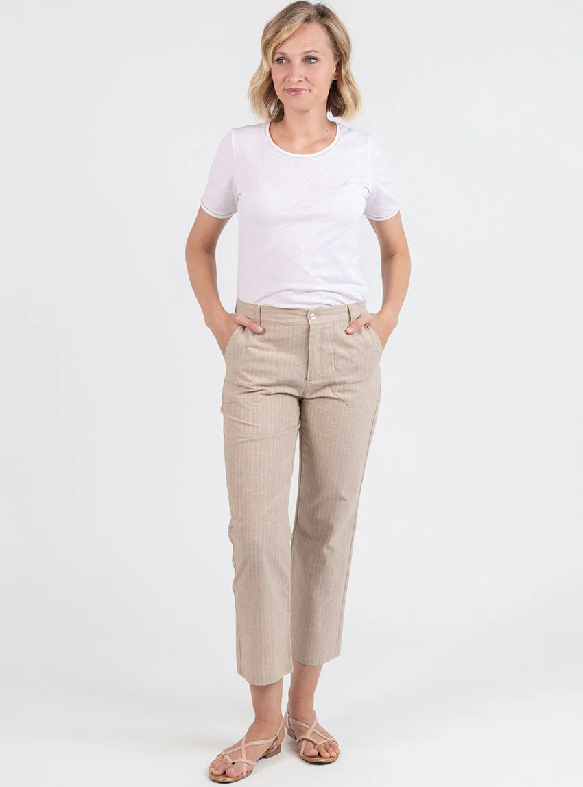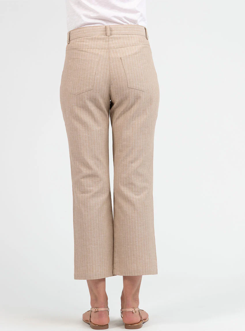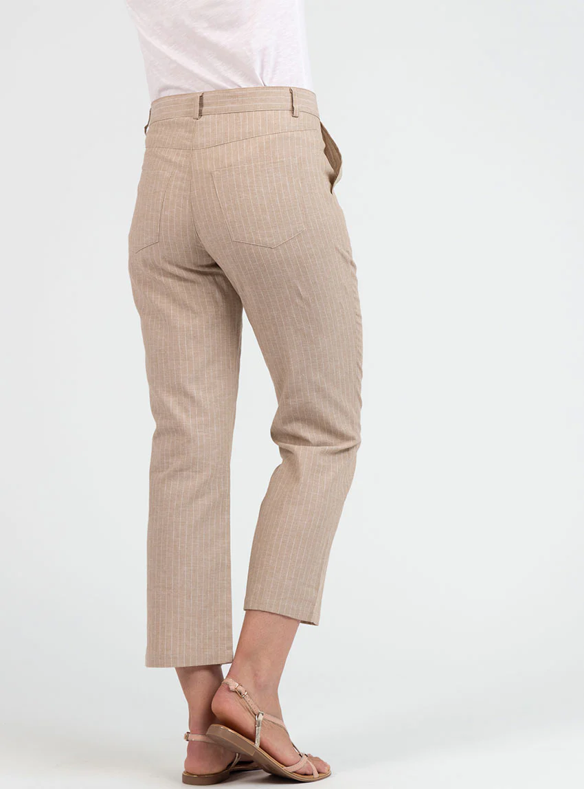 Pantalon 7/8ème femme rayé beige en coton et lin. Taille haute ajustée, jambes larges et confort léger.